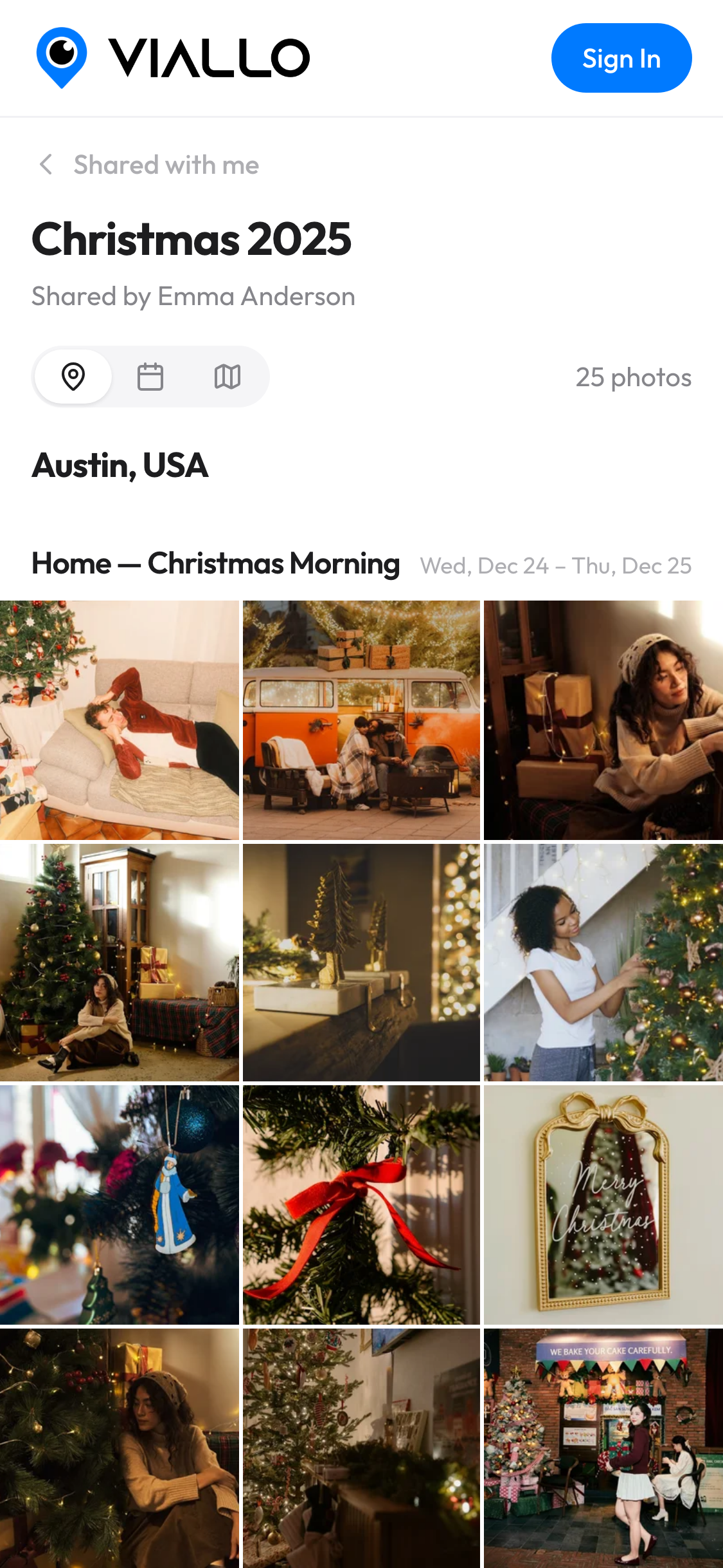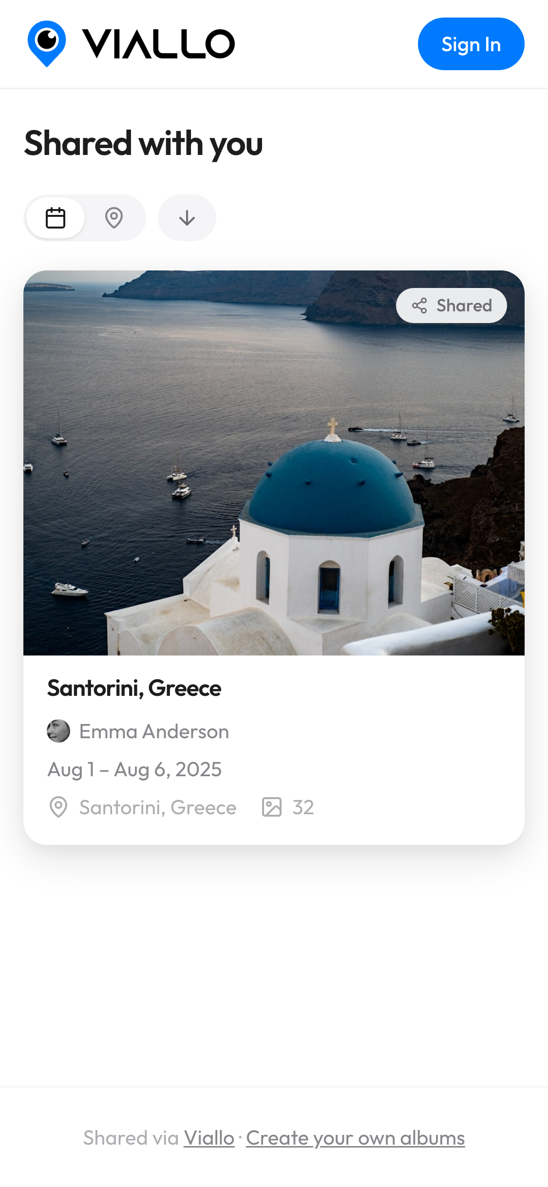Anyone with the link can view your photos immediately β no account needed. Just click and browse the full album with all your photos grouped by place.