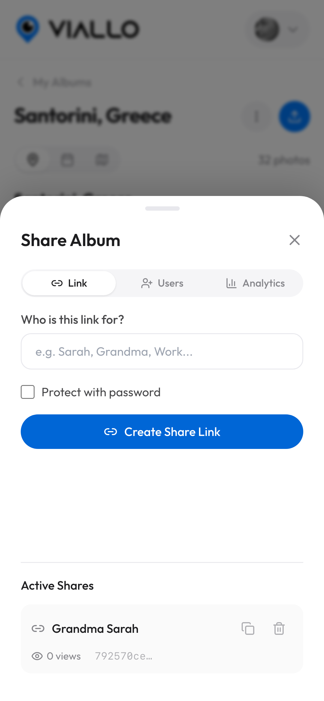 Generate a private link and send it to anyone. Add a password for extra security or share directly with other Viallo users. Viewers see a beautiful gallery - no account required.