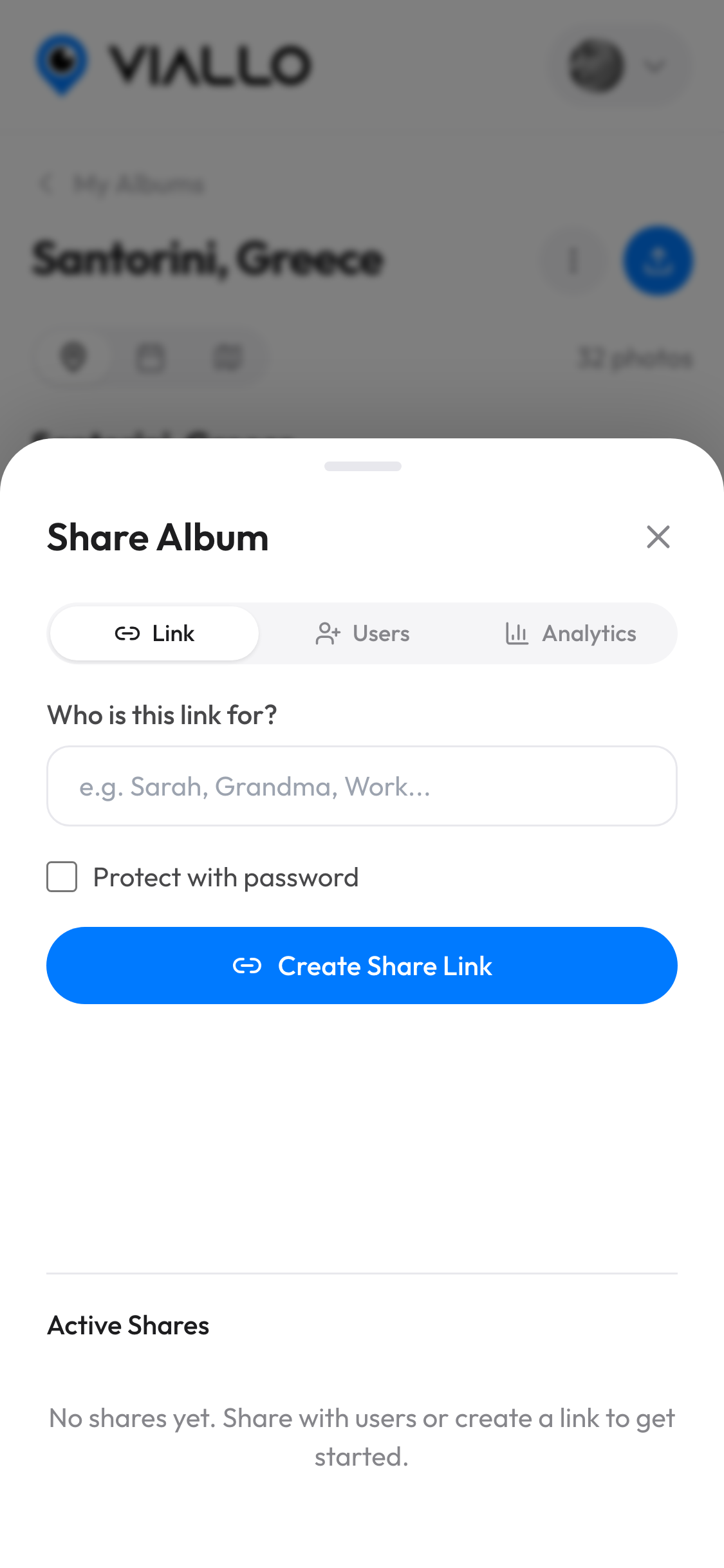 Name your album, then upload photos straight from your phone or computer. Select multiple files at once - Viallo handles the rest with parallel uploads and real-time progress tracking.